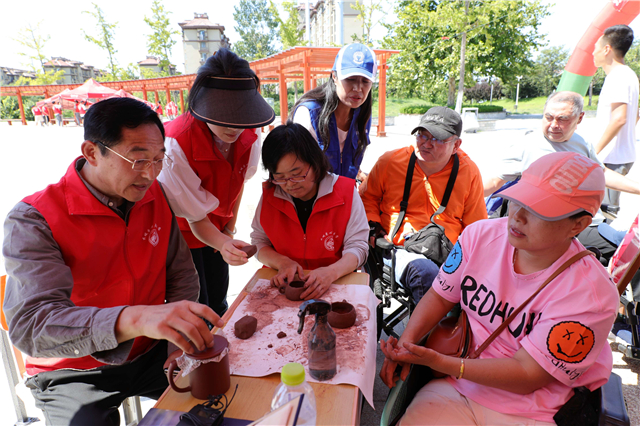 輪椅舞、葫蘆絲獨奏、廣場舞……現場“扶志”展區內,殘疾人朋友們帶來了精彩表演,表達著他們對生活熱情和對美好生活的向往;“扶智”展示區里,“輪椅畫家”王剛現場示范教學,眾人聚精會神聽著,不時互動交流,暢談學習體會;“致富”展示區中,百幅油畫作品錯落有致,各種畫風變化皴染有致、各具特色,一旁的長桌之上則擺滿了各種形狀大小不一、造型風格各異的紫砂成品,吸引著來往人群駐足賞析,不少人更是紛紛慷慨解囊。