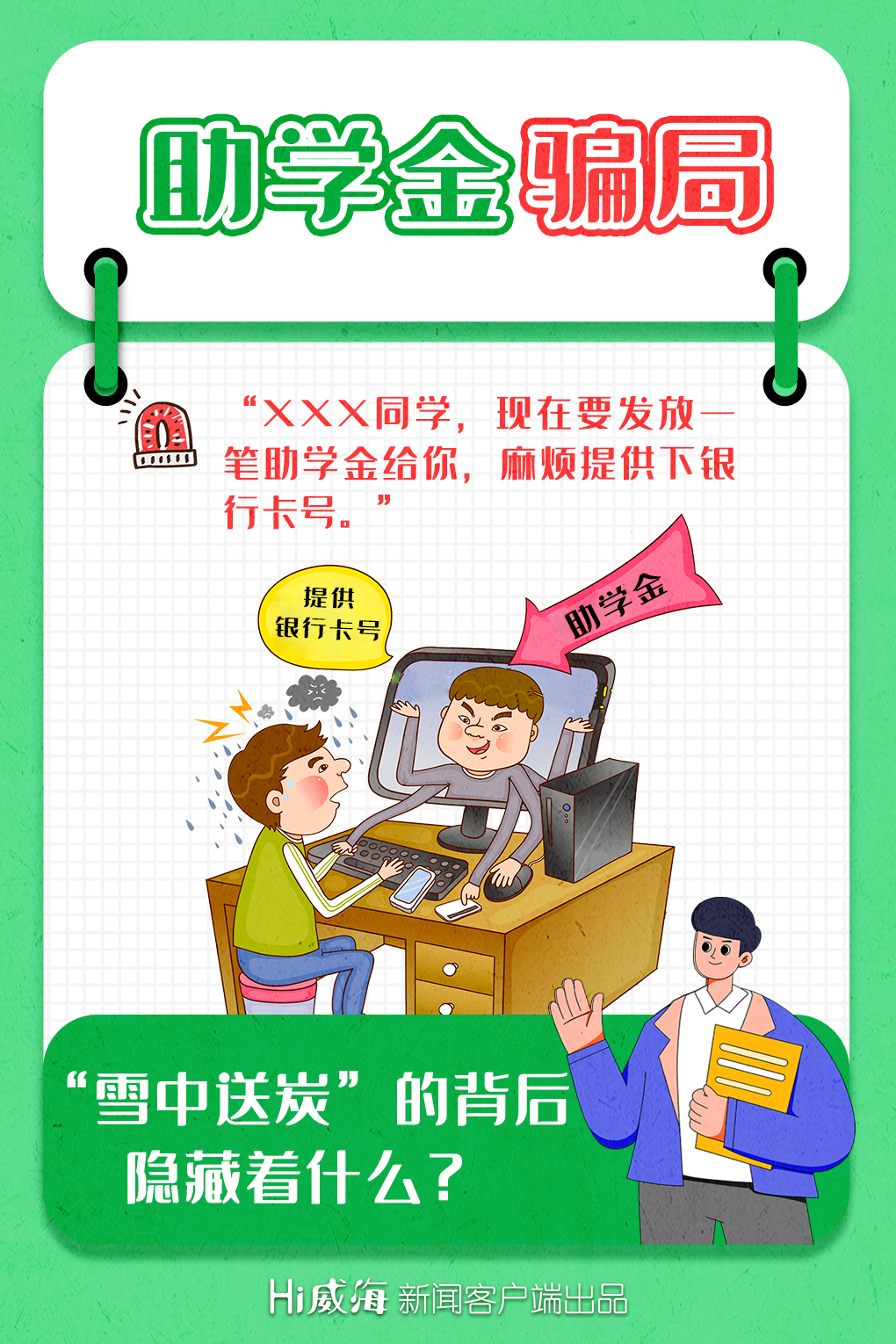 ??????當今社會,網絡技術的發展給我們的生活提供便利的同時,也給我們帶來了一定的受騙風險,缺乏社會經驗的大學生更是許多不法分子眼中的“香餑餑”。這份《大學生防詐騙指南》請收好,一起練就火眼金睛,提高防騙意識。