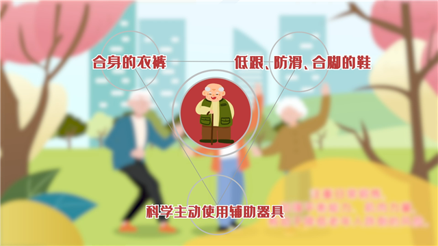 3.穿合身的衣褲,穿低跟、防滑、合腳的鞋,科學(xué)主動(dòng)使用手杖等適老輔助器具。