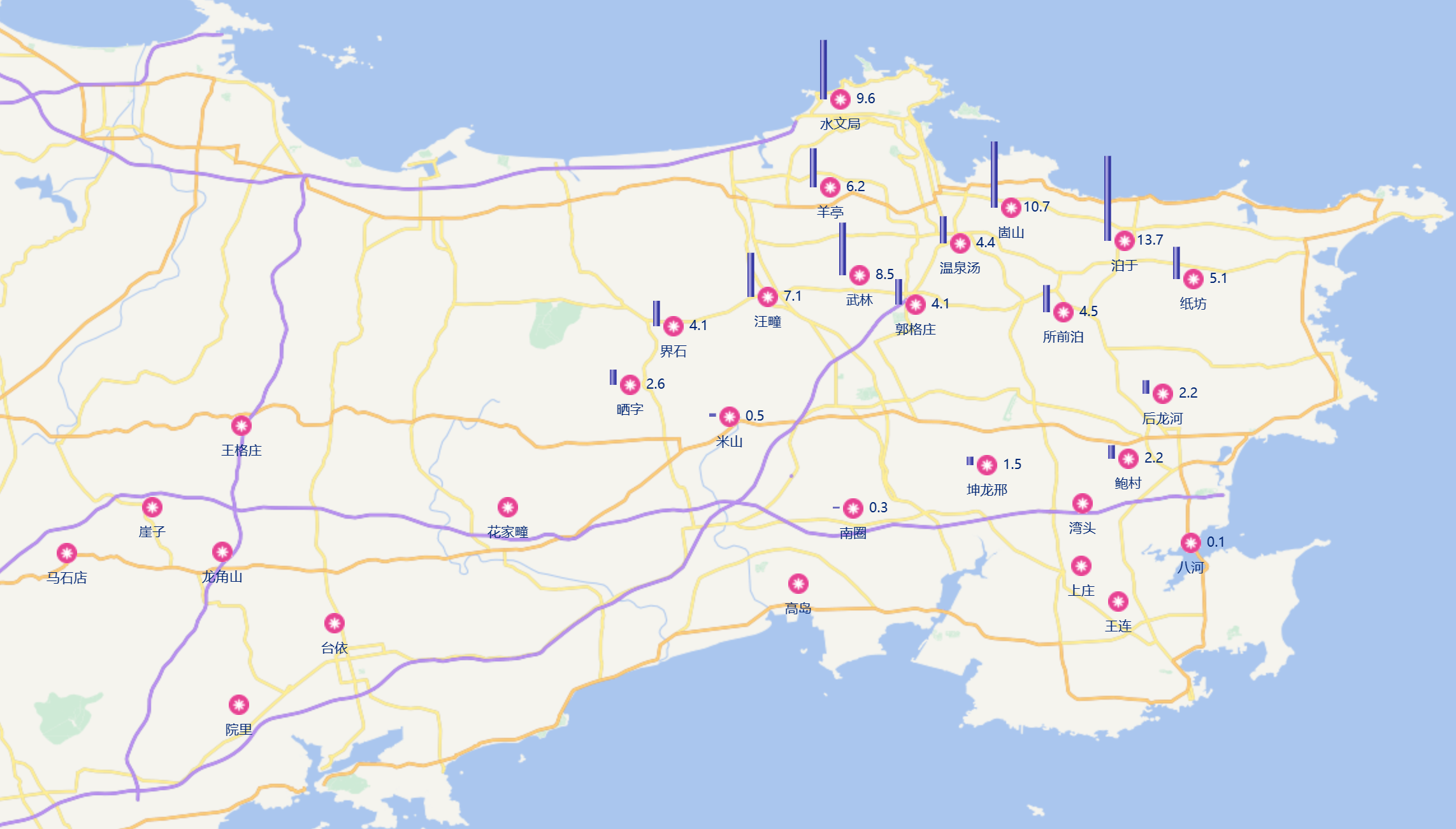 ??????降水信息(雪化水):11月30日8時至12月1日8時,全市平均降水量3.1(單位:mm,下同),環翠區5.3,文登區1.8,榮成市1.2,乳山市0.0,高區9.6,經區9.6,臨港區6.6,南海新區0.0。最大降水量站點經區泊于13.7。