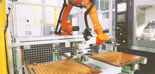 在威海光威戶外裝備有限公司生產車間內,PLC控制機器人正對機床進行上下料工作。