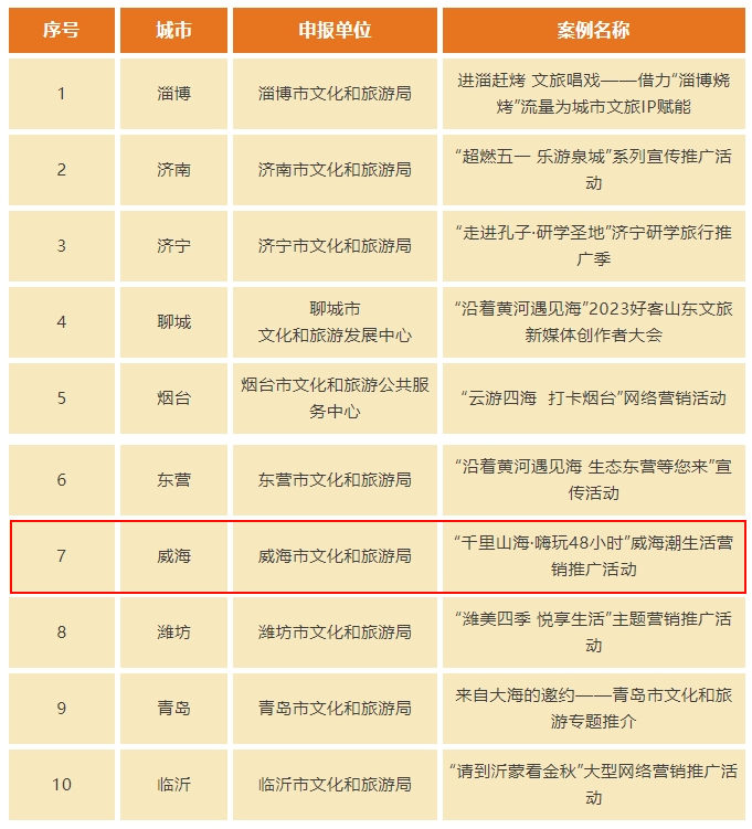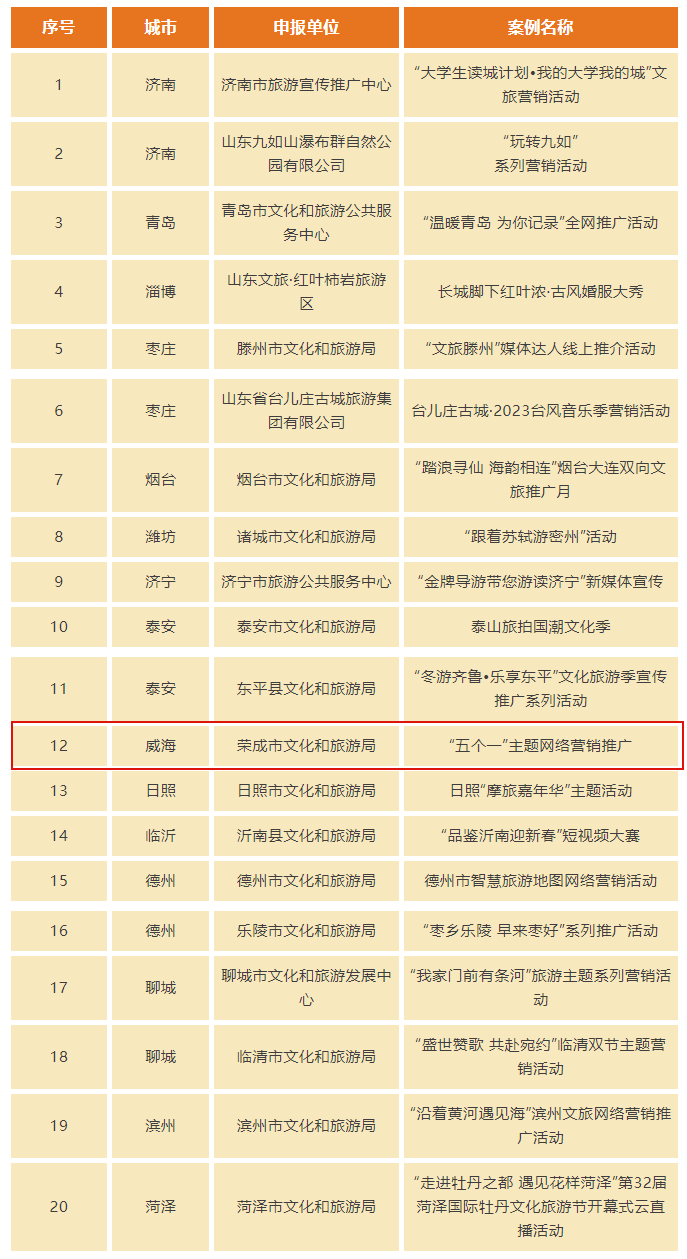 ??????為持續提升全省旅游宣傳推廣創新發展水平,加快塑造山東文旅新優勢,助力文旅產業高質量發展,山東省文化和旅游廳組織開展全省國內旅游宣傳推廣優秀案例征集評選工作。經專家評選,確定2023年度“好客山東”國內旅游宣傳推廣十佳案例10個、優秀案例20個。其中,威海“千里山海·嗨玩48小時”威海潮生活營銷推廣活動上榜2023年度“好客山東”國內旅游宣傳推廣十佳案例名單,威海“五個一”主題網絡營銷推廣上榜2023年度“好客山東”國內旅游宣傳推廣優秀案例名單。