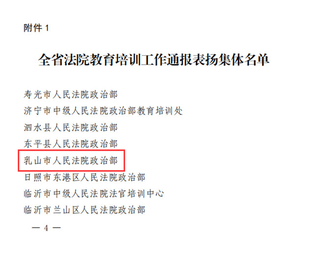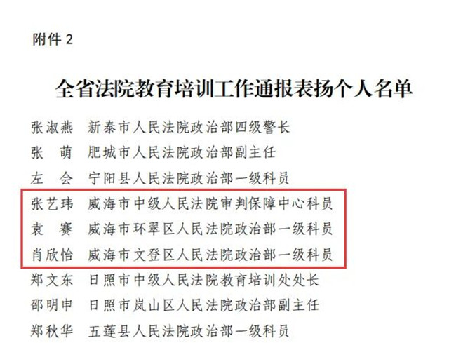 山東省高級(jí)人民法院下發(fā)《關(guān)于表揚(yáng)在全省法院教育培訓(xùn)工作中表現(xiàn)突出集體和個(gè)人的通報(bào)》,其中,威海法院1個(gè)集體、3名個(gè)人獲獎(jiǎng),乳山市人民法院政治部獲評(píng)表現(xiàn)突出集體,威海中院張藝瑋、環(huán)翠區(qū)法院袁賽、文登區(qū)法院肖心怡獲評(píng)表現(xiàn)突出個(gè)人。