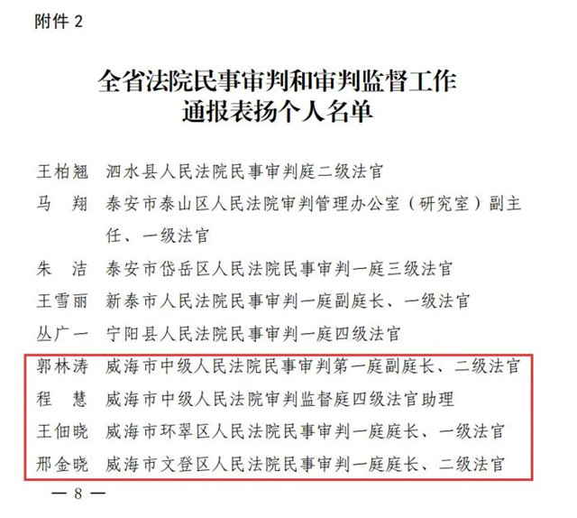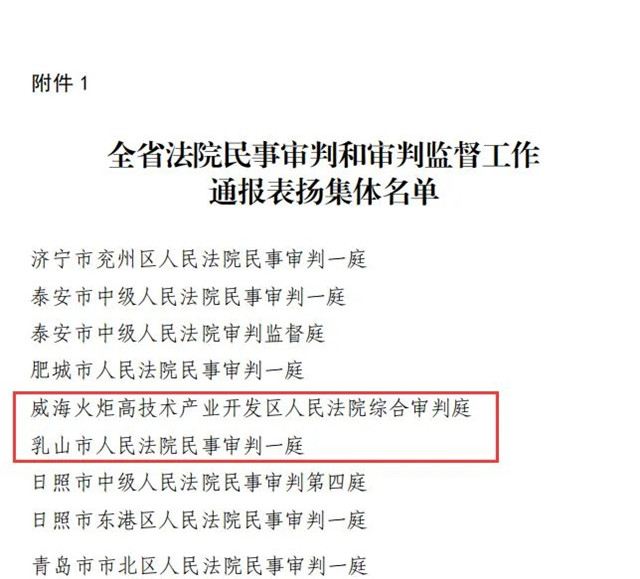 山東省高級(jí)人民法院下發(fā)《關(guān)于表揚(yáng)在全省法院民事審判和審判監(jiān)督工作中表現(xiàn)突出集體和個(gè)人的通報(bào)》,其中,威海法院2個(gè)集體、4名個(gè)人獲獎(jiǎng),威海火炬高技術(shù)產(chǎn)業(yè)開發(fā)區(qū)人民法院綜合審判庭、乳山市人民法院民事審判一庭獲評(píng)表現(xiàn)突出集體;威海中院郭林濤、程慧,環(huán)翠區(qū)法院王佃曉、文登區(qū)法院邢金曉獲評(píng)表現(xiàn)突出個(gè)人。