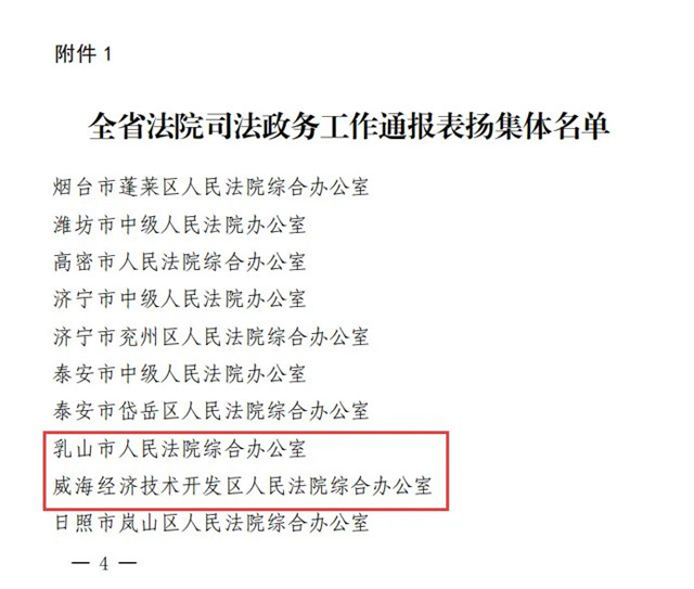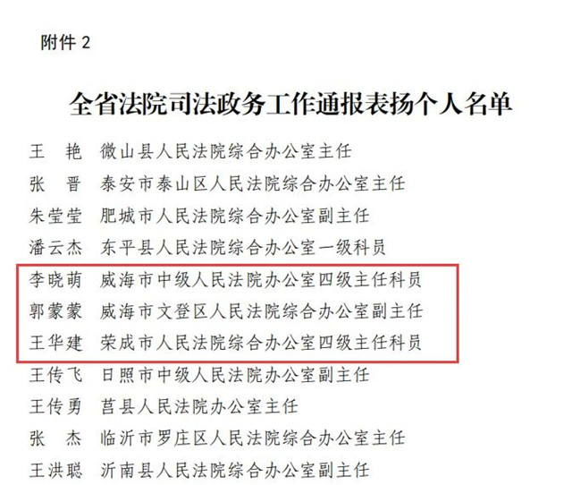 山東省高級(jí)人民法院下發(fā)《關(guān)于表揚(yáng)在全省法院司法政務(wù)工作中表現(xiàn)突出集體和個(gè)人的通報(bào)》,其中,威海法院2個(gè)集體、3名個(gè)人獲獎(jiǎng),乳山市人民法院綜合辦公室、威海經(jīng)濟(jì)技術(shù)開發(fā)區(qū)人民法院綜合辦公室獲評(píng)表現(xiàn)突出集體,威海中院李曉萌、文登區(qū)法院郭蒙蒙、榮成法院王華建獲評(píng)表現(xiàn)突出個(gè)人。