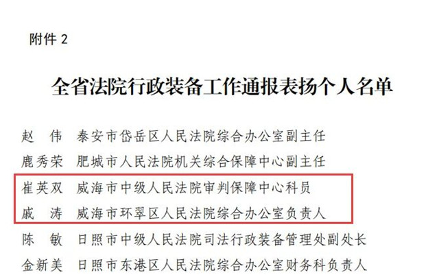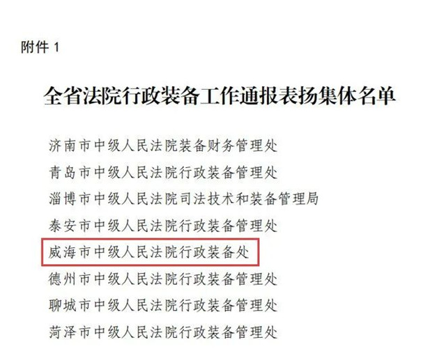 山東省高級(jí)人民法院下發(fā)《關(guān)于表揚(yáng)在全省法院行政裝備工作中表現(xiàn)突出集體和個(gè)人的通報(bào)》,其中,威海法院1個(gè)集體、2名個(gè)人獲獎(jiǎng),威海市中級(jí)人民法院行政裝備處獲評(píng)表現(xiàn)突出集體,威海中院崔英雙、環(huán)翠區(qū)法院戚濤獲評(píng)表現(xiàn)突出個(gè)人。
