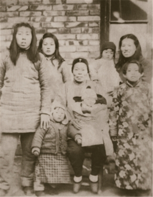 梁恒力的乳娘王殿英(前排左一)、梁恒心(前排左二)、抱著梁恒華的姥姥(前排中)、小姨王玉欣(前排右一)與梁恒華的乳娘于連英(后排左一)、抱著梁恒力的母親王梅欣的合影