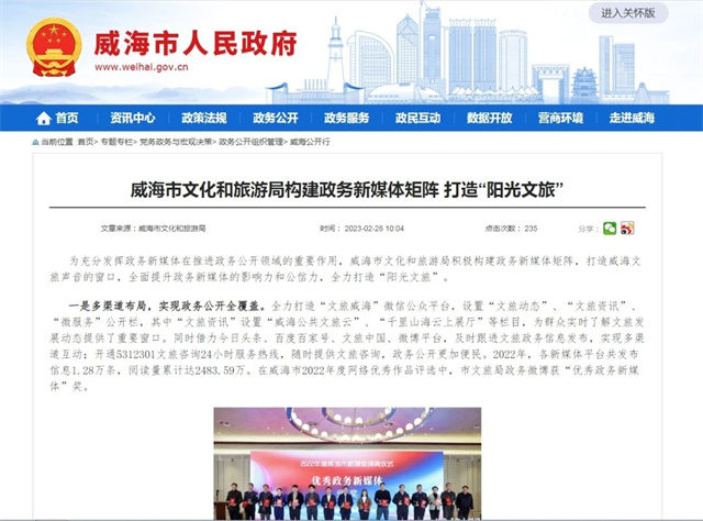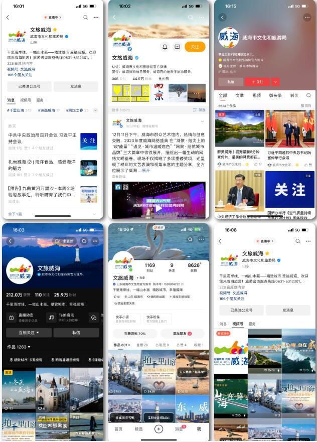 2023年以來,“文旅威海”新媒體矩陣蓬勃發展。通過強化構建數字文旅平臺,整合微信、微博、今日頭條、百度百家號、文旅中國等五大圖文平臺和抖音、快手、視頻號三大短視頻平臺,聯動各區市文旅政務新媒體,充分挖掘全市美景、美食、文化、好品、文物、非遺等特色元素,全面涵蓋了發展政策、旅游安全、文化活動、旅游攻略、旅游餐飲、旅游住宿、文明旅游等多元化內容,發揮不同媒介的傳播優勢,讓各類文旅資源在云端匯聚。同時及時防范化解輿情風險,實時監測負面輿情并組織正向引導,共創風清氣正的網絡輿論環境。