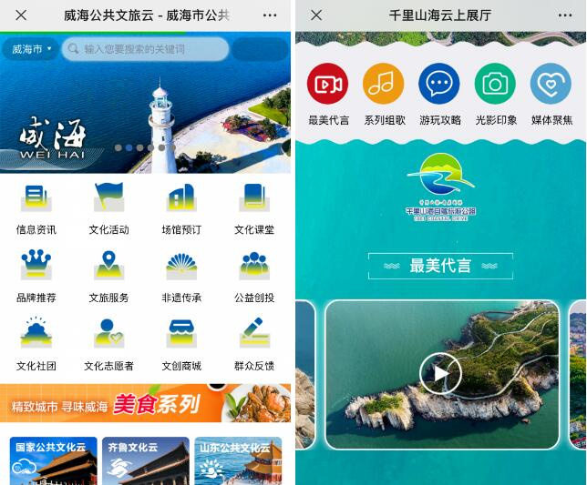 依托“文旅威海”微信公眾平臺,線上布局“文旅動態”“文旅資訊”“微服務”等服務欄,一鍵鏈接“威海公共文旅云”“千里山海云上展廳”等小程序,為群眾實時查詢文旅動態、線路攻略等提供云端窗口。