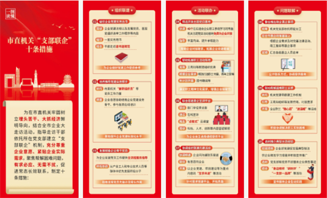 創新制定“支部聯企”十條措施,指導70個黨組織與906家企業建立常態聯系,通過組織聯建、活動聯辦、問題聯解,編印“支部聯企”叢書2000余套,協調80個市直機關主題黨日活動基地向企業開放,協力幫解企業困難問題1400多個。