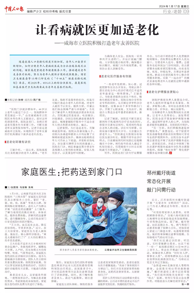 ??????1月17日,《中國人口報》以《讓看病就醫更加適老化》為題,聚焦威海市立醫院關于建設老年友善型醫院相關工作經驗,以下為報道原文: