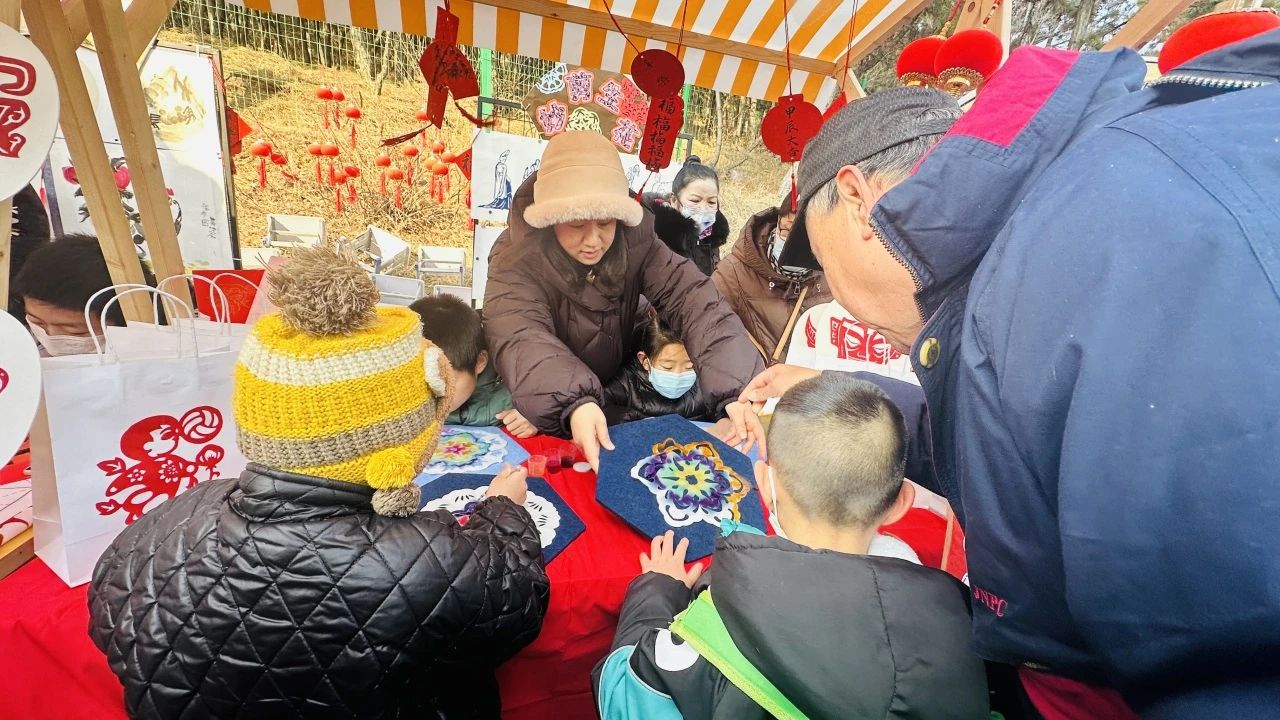 在“非遺”體驗區(qū),編結(jié)、拓印、面塑等傳統(tǒng)工藝進行活態(tài)呈現(xiàn),游客還能體驗一把投壺納福、冰壺等互動項目,就此開啟一場沉浸式“非遺”體驗之旅,趣味無窮。