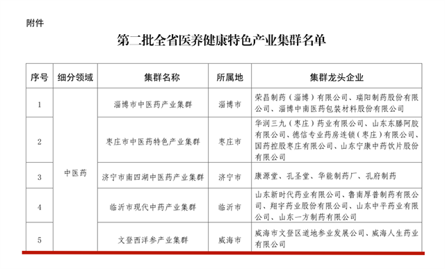 近日,山東省醫(yī)養(yǎng)健康產(chǎn)業(yè)專班(山東省衛(wèi)生健康委)公布了第二批全省醫(yī)養(yǎng)健康特色產(chǎn)業(yè)集群名單,本次公布的11個特色產(chǎn)業(yè)集群涵蓋了中醫(yī)藥、健康養(yǎng)老、健康美業(yè)3個細分領域,威海市文登西洋參、健康美業(yè)2個產(chǎn)業(yè)集群入選。