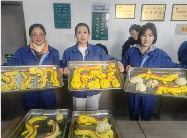 培訓現場,老師從發酵面粉、塑形、蒸制等各個環節進行現場授課。女職工們從發酵面粉開始,在老師的帶領下先揉出雛形,再借助筷子、剪刀、搟面杖等工具,將觸角、手腳等裝飾到餑餑上,一個漂亮的屬相龍就做成了。