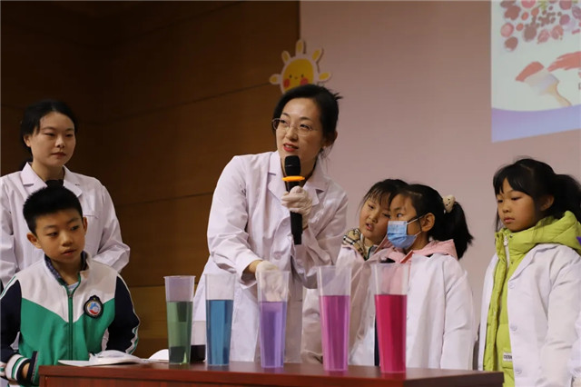 市水文中心科普講解員從水文化、水與生命、世界水日與中國水周、水文水質水生態監測知識、節水小妙招五大視角,為師生詳細講解了水資源現狀及保護治理方面的知識。在有獎問答環節,孩子們積極舉手答題,氣氛熱烈。在活動現場,水質科工作人員更是邀請學生上臺動手做起了花青素遇到不同酸堿度的水的變色實驗。有趣的實驗、豐富的事例、科學的數據、多元的搶答互動,點燃了學生們探索科學奧秘的極大興趣和熱情,引發了學生的陣陣掌聲和歡呼。同時,活動中還為市水文中心前期聯合高區科技小學舉辦的“節水愛水 我有畫說”主題活動獲獎選手頒發精美禮品。