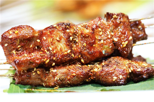 烤好的肉串肥瘦相間,筋膜相連,晶瑩剔透,一口咬下去,牙齒瞬間點燃肉的的肌理,口腔里綻放起肉汁的煙花,一朵接著一朵,欲罷不能,根本停不下來。