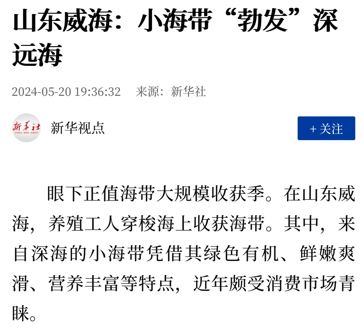 5月20日,新華社以《山東威海:小海帶“勃發(fā)”深遠海》為題,聚焦我市聚力做好經(jīng)略海洋大文章,引導企業(yè)加速產業(yè)轉型升級經(jīng)驗做法,以下為報道全文: