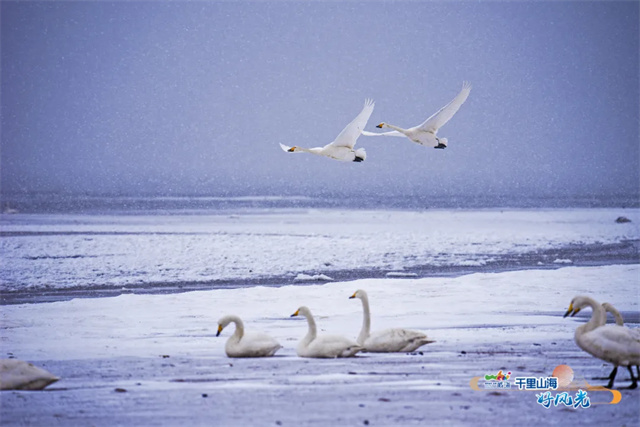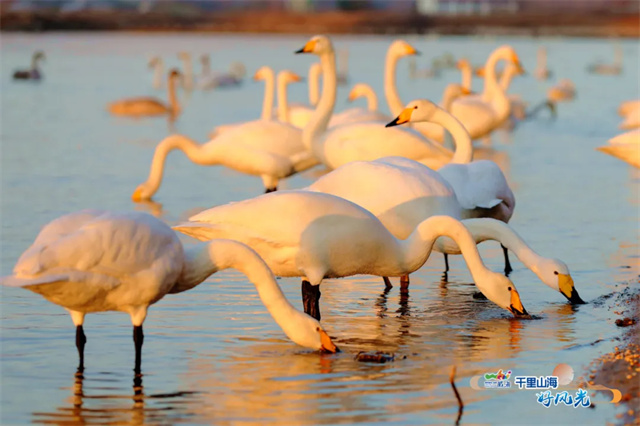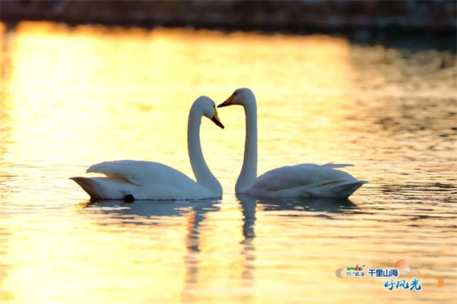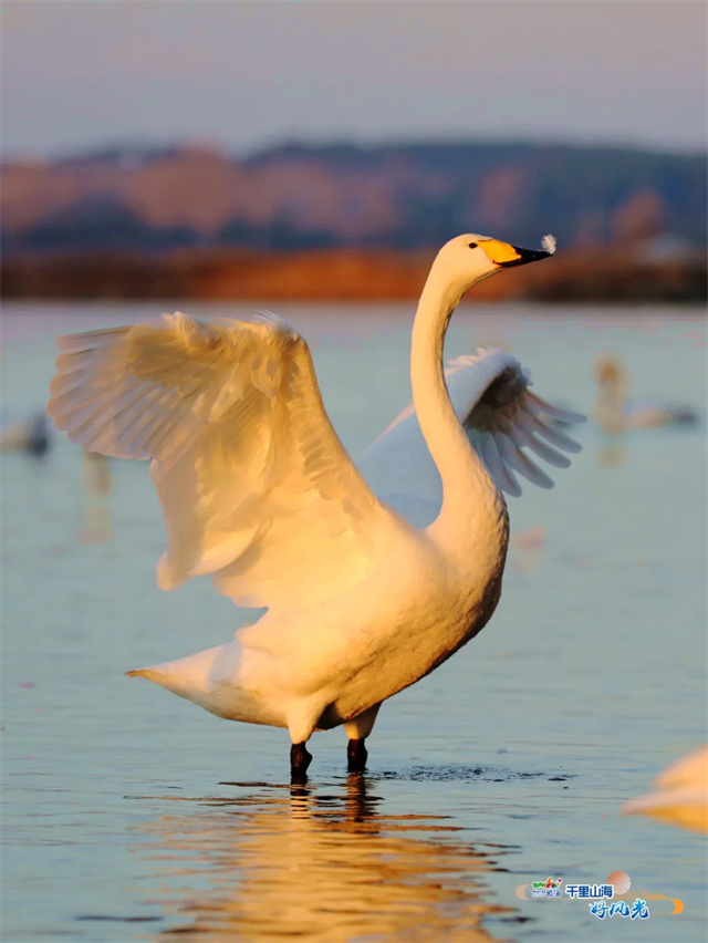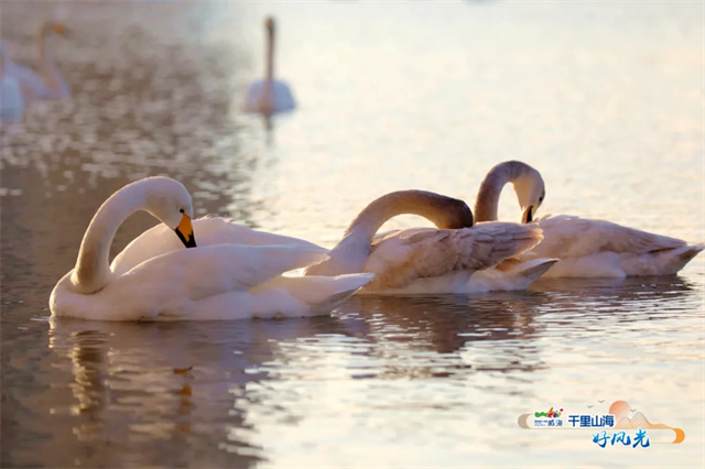 每到拂曉時分,順著曦光撥開晨霧,湖面上已然“熱鬧”了起來,數不清的大天鵝振翅飛來,高歌著來自西伯利亞的浪漫旋律,在瀲滟湖色之上優哉游哉行,起舞弄清影,婀娜的身姿與水光相依相映。