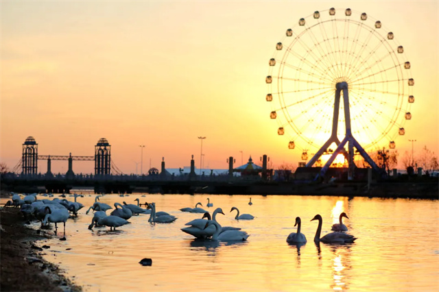 遠處,一輪旭日正從湖面上緩緩升起,從玫瑰色的天際到胭脂紅的朝霞,再到溫柔也燦爛的金色天地,追逐著晨光,看摩天輪、棧橋的光影交錯,看一行天鵝越過云層的痕跡,看波光粼粼的“橘子湖”上,好一出日出浪漫的畫面,此時此刻,心動滿分。