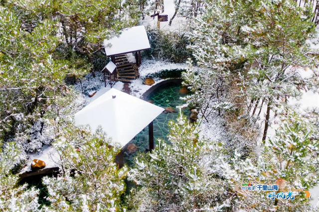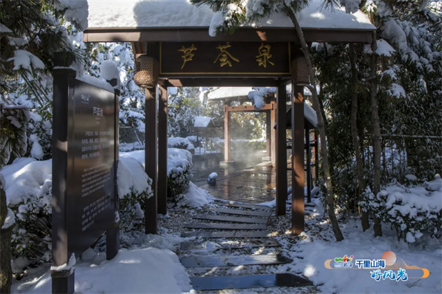 雪后初霽,大大小小的溫泉池于林間若隱若現,周圍郁郁蔥蔥的綠意被鋪上了一層雪白的點綴,似仍有飄飄揚揚的落雪融入蒸騰的熱氣,若此時擇一湯池坐下,便有了“泉在雪中,人在泉中”的別樣意趣。