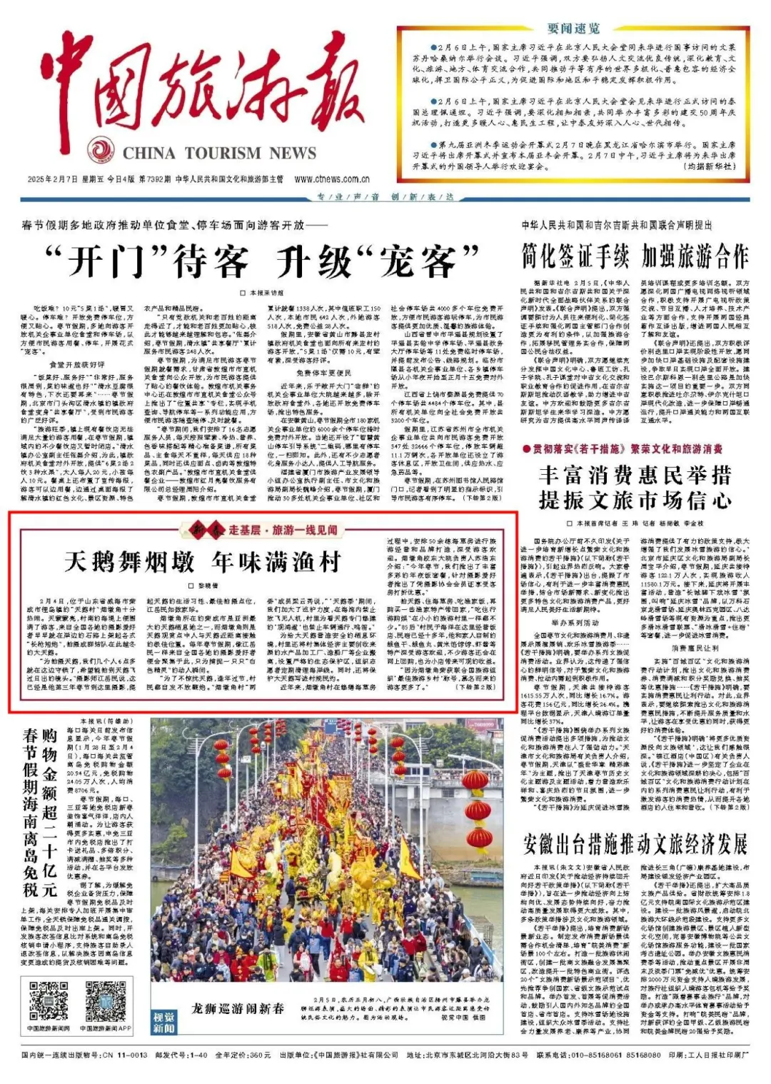 ????????近日,《中國旅游報》以《天鵝舞煙墩 年味滿漁村》為題,聚焦世界“最佳旅游鄉村”煙墩角,解讀春節期間“拍大天鵝、住海草房、吃漁家飯”如何成為冬游威海的打卡新熱潮。以下為報道全文: