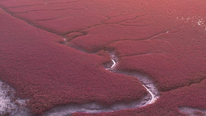 ????????南海新區昌陽河入海口處,大片的紅海灘舒展蔓延,以一抹熱烈的嫣紅勾勒出獨特的生態畫卷,成為獨特的自然景觀。紅海灘的“主角”是耐鹽堿的翅堿蓬。這些扎根灘涂的植物生命力頑強,簇擁生長成連綿的“紅色海洋”,曾多次登上中央電視臺。潮起潮落間,灘涂被沖刷出蜿蜒的紋理,宛如“大地之樹”的根系舒展,與成片的翅堿蓬相映,形成“潮汐作畫、紅灘為墨”的奇景。微風拂過,紅色草甸泛起漣漪,白鷺、蒼鷺不時掠過水面,動靜之間,恰似一幅濃墨重彩的夏日生態畫卷。深秋時節,紅海灘全面泛紅,是觀賞的最佳時候。