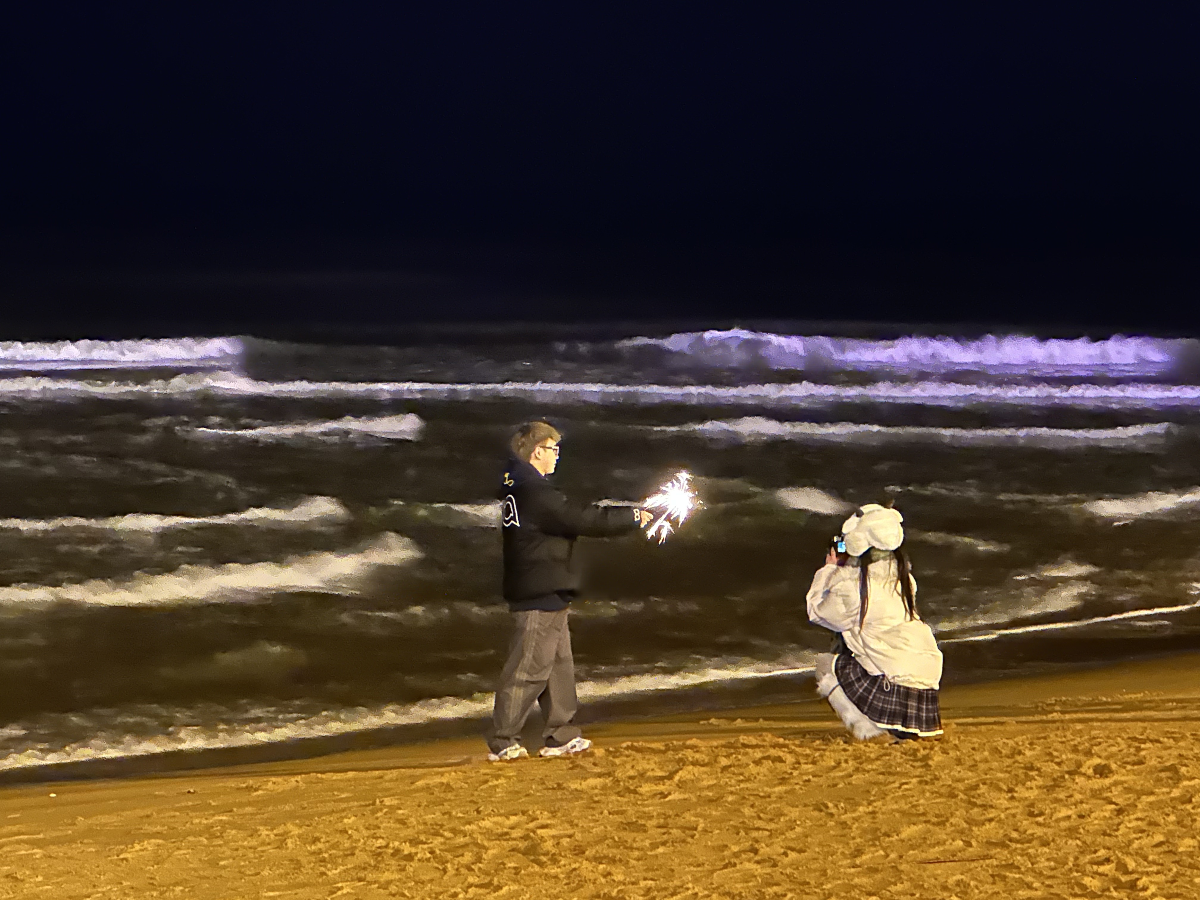 ????????“在市中心跨年,聽到的是人群的歡呼。在這里,你聽到的是海浪一遍遍沖刷岸邊的聲音,像時(shí)間的腳步聲。”來(lái)自廣西的青年陳千熙裹著厚厚的圍巾,他目光看向大海,身邊的朋友為他拍下了站在火炬八街凝望大海的照片。“我要把這一刻記錄在心里。今晚我們要趕赴榮成,去拍攝布魯維斯沉船。”陳千熙說(shuō)。