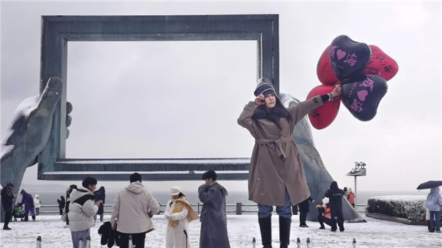 ? 除了這些“有備而來”的游客,不少人還收獲了意外之喜。來自廣東的鄒琳琳原本計劃昨天就結束旅行,踏上返程的列車,前一晚聽說今日有雪,她當即決定改簽,延遲行程。“活了30多年,這是我第一次見這么大的雪!”站在幸福門廣場上,鄒琳琳仰頭望著漫天飛舞的雪花,忍不住感嘆“威海真的好靚哦!”她特意將威海的最后一站定在幸福門,不僅看了雪后海濱的景色,還體驗了喂海鷗的樂趣,潔白的海鷗在雪中盤旋,被她永遠定格在相機里。