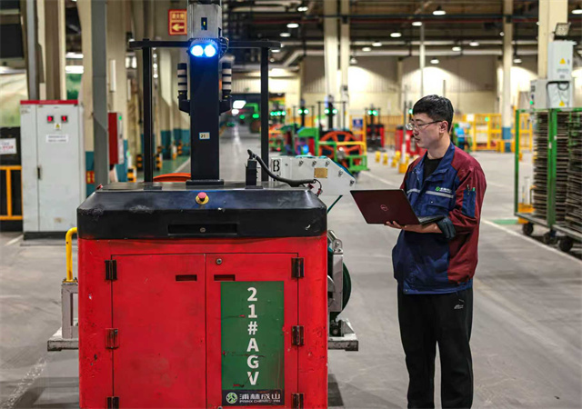 ????????浦林成山(山東)輪胎有限公司智能化生產車間內,自動駕駛智能運輸車配送原料。