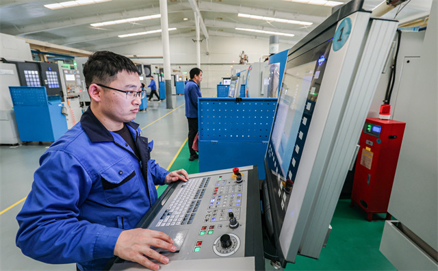 ????????在天潤工業曲軸智能制造事業部生產車間內,工人正檢驗產品。