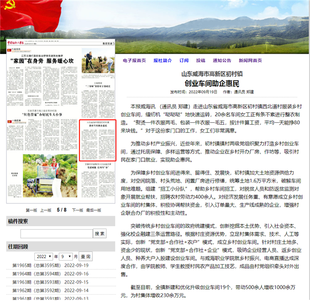 《中國(guó)組織人事報(bào)》聚焦:威海高新區(qū)初村鎮(zhèn)創(chuàng)業(yè)車間助企惠民