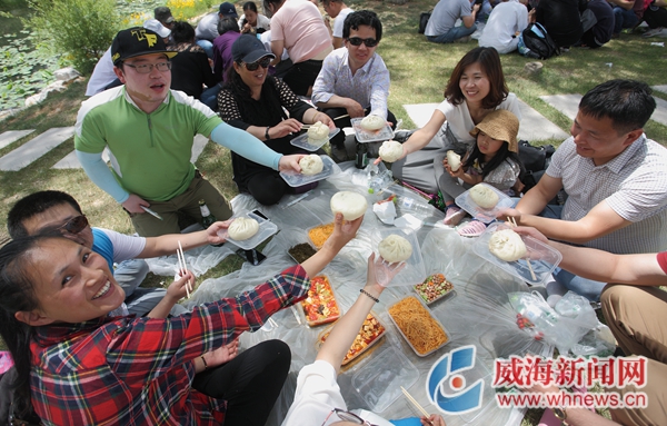 ????午餐時間到了,雙舉海參提前準備了熱騰騰的飯菜以及涼爽的飲料,大家席地而坐,快樂無比!更難能可貴的是,80名盲人朋友第一次品嘗到了雙舉海參員工提前為他們準備的海參槐樹花包子,讓他們感動不已。