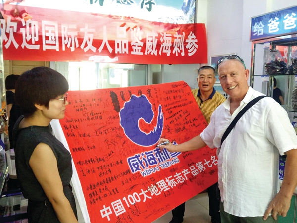 ????莫瑞德第一次走進雙舉海參,在了解了雙舉海參的品質后大加贊賞,高興地在“威海刺參”大旗上簽字,表示愿意助力威海刺參品牌發展。