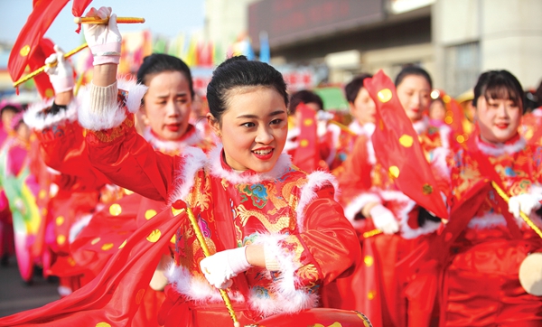 ????鑼鼓喧天鬧新春,民俗演出年味濃。1月27日,張村鎮(zhèn)村民表演秧歌。