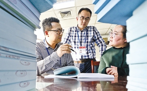 趙明君(左)在為企業梳理政策。記者 劉志鵬 攝