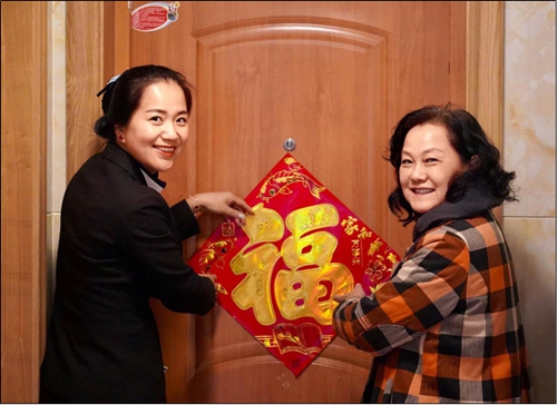 在春節(jié)來臨之前,易美家物業(yè)的工作人家便挨家挨戶為業(yè)主送福字,與業(yè)主共同將福字張貼好,將年味送到業(yè)主家中。每一張福字都承載了易美家物業(yè)對業(yè)主滿滿的祝福和貼心的服務(wù),對于遠(yuǎn)在天南海北的業(yè)主們,管家專程郵寄香海度假報(bào)和那香雜志,寄出新年祝福。