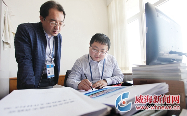 楊殿慧(右)在和同事研究相關政策。 本報記者 劉志鵬 攝