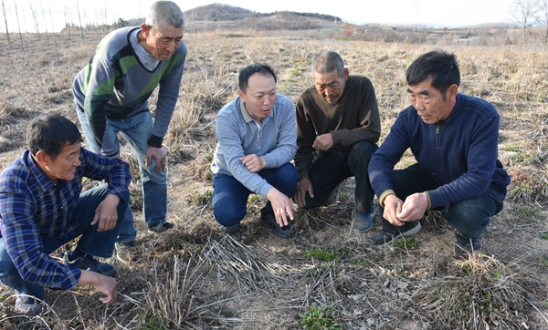 張濱(中)和村民們討論今年的金雞菊種植情況。 通訊員 曲向陽 攝