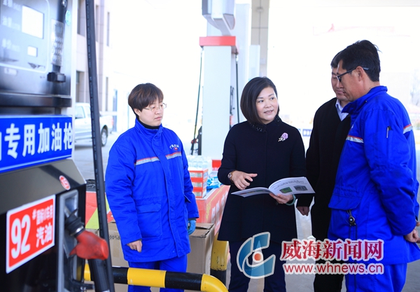 林喆(左二)向加油站工作人員推介新型油品回收技術(shù)。 記者 朱春曉 攝