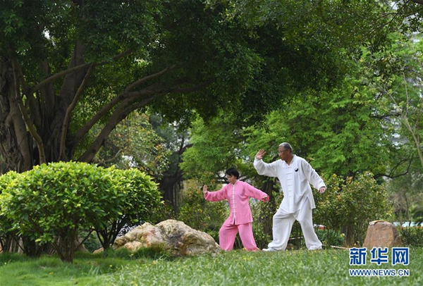 ????4月8日,市民在南寧市南湖南廣場(chǎng)的綠蔭下健身。