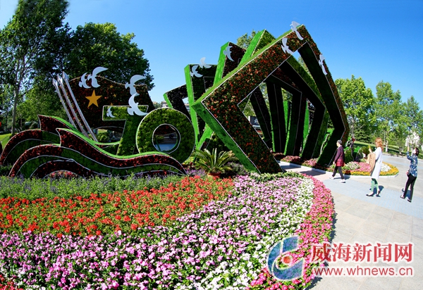 昨日,市民在市人民廣場欣賞花卉景觀《歷程》。為慶祝新中國成立70周年,市園林部門在市人民廣場、環翠樓廣場等處布置花卉景觀,既營造了喜慶氣氛,又讓城市更加靚麗。據了解,所有花卉景觀月底前完工。 威海晚報記者 姚威 攝