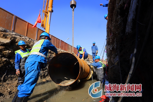 5月30日,在高新區天津路熱網改造現場,威海熱電集團員工正在進行管道吊裝與焊接。