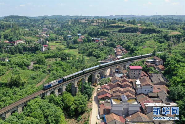 成渝鐵路王二溪大橋采用了中國傳統的石拱橋建造技術,成為國內少有的鐵路石拱橋(6月13日無人機拍攝)。新華社記者薛玉斌攝