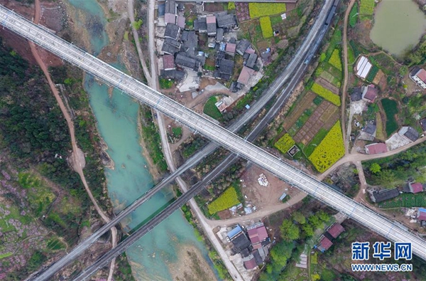 在四川省江油市,西成高鐵四川段青崗壩特大橋橫跨寶成鐵路(2017年3月29日攝)。新華社記者 薛玉斌 攝