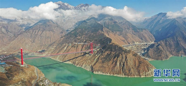 ????雅康高速公路瀘定大渡河興康特大橋(2018年12月30日無人機拍攝)。2018年12月31日,位于四川的雅康高速公路全線建成并試通車運營,從而結束了四川省甘孜藏族自治州州府所在地康定市不通高速公路的歷史。新華社記者 江宏景 攝