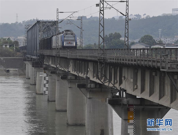 7月11日,一列火車行駛在寶成鐵路涪江鐵路大橋上。新華社記者 劉坤 攝