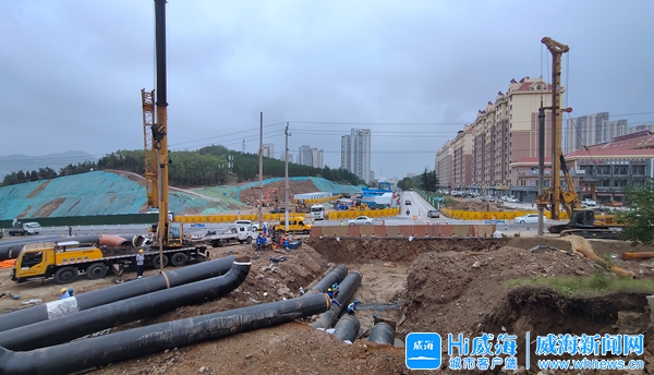 ????8月14日上午,因受臺風“科奇馬”影響而暫時停工的大連路東延項目,又恢復了緊張施工。南起洪福莊園西門、北至威海熱電集團東門的古寨西路下穿通道工程,全長558米,是該項目三個關鍵節點之一。眼下,供熱主管道的改線工程與附路路基打樁支護工程正同時進行。