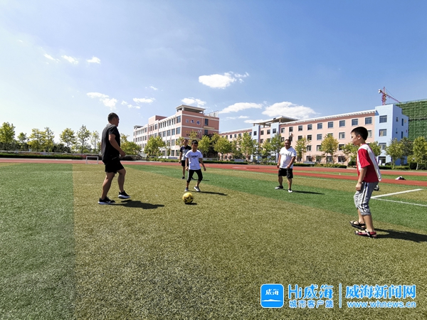居民和孩子在威海南海實驗小學踢足球。
