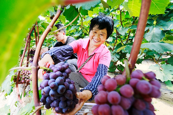 ????正趕上景翔果蔬的采摘節(jié),現(xiàn)代化采摘大棚內(nèi)瓜果飄香。一路走來(lái),不時(shí)能見(jiàn)到滿載而歸的游客。“來(lái)得正好!剛摘的葡萄和紅心火龍果,嘗一嘗!”合作社經(jīng)理張福建熱情地迎上來(lái)。在他身旁,整齊碼著五六箱剛裝好的火龍果。他介紹,這幾天北京交通大學(xué)威海校區(qū)開(kāi)學(xué),來(lái)游玩的游客不少,當(dāng)天上午就有20多名外國(guó)留學(xué)生“組團(tuán)”來(lái)采摘。