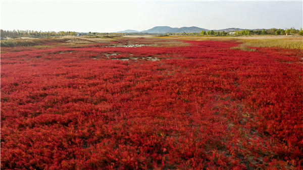 昌陽河下游連綿的翅堿蓬,在水天一色中顯得格外溫柔平靜,似火的翅堿蓬與天藍的水面相交織,綿延至盡頭與天空相接,一種開闊與深沉會不請自來。水面上,眾鳥云集、萬羽競翔,形態各異的鳥兒在水面上盤旋飛舞、游弋覓食,一切那么地和諧安靜,勾勒出一幅和諧自然的美好畫卷。